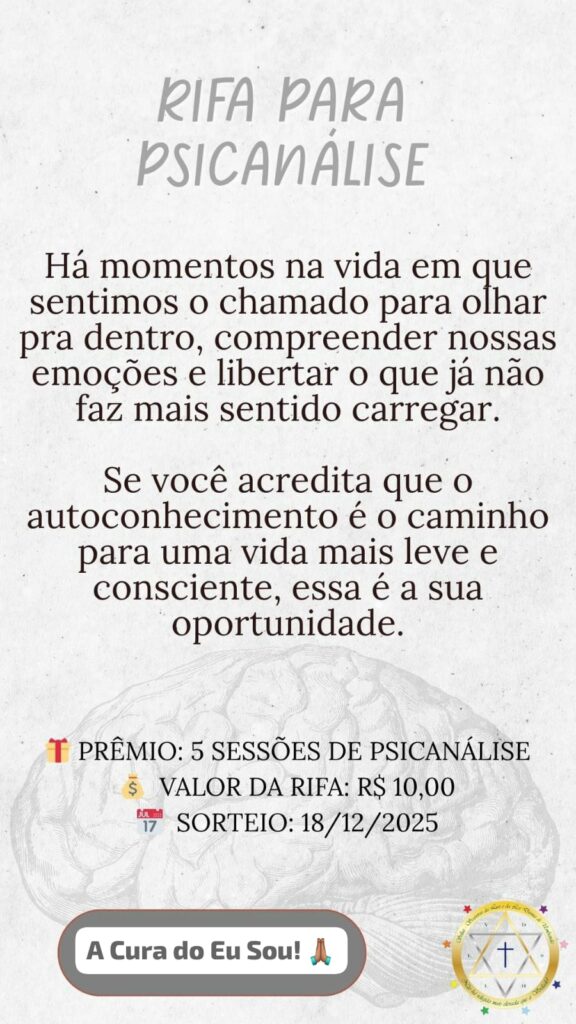 Estamos realizando uma rifa especial, que sorteará 5 sessões de psicanálise integradas com princípios de hipnoconstelação, uma experiência profunda de reconexão com você mesmo(a), onde mente, corpo e alma se alinham para abrir espaço ao novo.